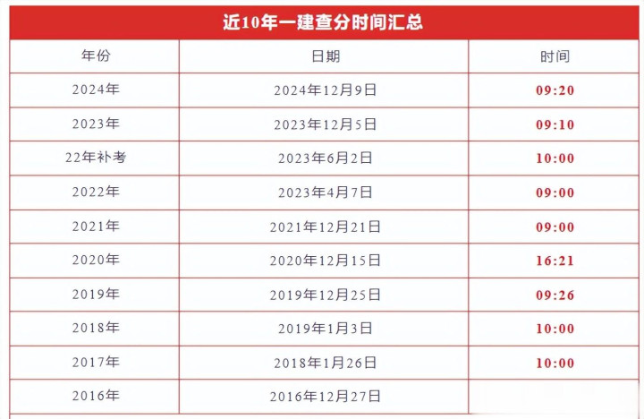 一建成绩查分日期大家有大概发底了,那么具体的查询时间会是几点呢?小编整理了近10年的10次考试出分情况!供大家参考!综合这个情况,感觉上午的可能性极大。